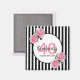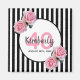 A magnet for a 40th birthday party. Classic slim black and white vertical stripes as background. With girly and feminine pink roses as decoration.