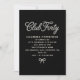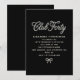 Elegant black and white invitation features white pearl script and a tiny pearl bow on a black background. Club Forty gives it a hip, trendy vibe and the bow at the bottom adds elegant femininity.