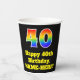 This fun and colourful birthday themed paper cup design features a large number “40” with a rainbow spectrum gradient inspired pattern, along with the message “Happy 40th Birthday,”, and a custom name. The background is coloured black. Colourful, vibrant paper cups like this might be fun to have at a birthday party being held in celebration of somebody’s 40th birthday. [~Z0000537]