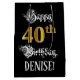 This elegant and elaborate birthday-themed gift bag design features the message “Happy 40th Birthday,”, plus a personalized recipient name. Some of the message is in a luxurious script-style text, the large number “40th” features a faux/imitation gold-inspired look pattern, and the background is colored black. An ornate birthday themed gift bag like this might be a respectable way to wrap a gift or present being given to celebrate somebody’s 40th birthday. [~Z0000560]