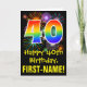 The front of this colorful, exciting, and fun birthday-themed greeting card design features a large number "40" with a rainbow spectrum gradient inspired pattern, along with the message "Happy 40th Birthday,", and an editable recipient name. The front additionally features a colorful background pattern inspired by bursting celebratory fireworks. The inside features a customized birthday greeting message, or could perhaps be cleared and left blank if a message is to be written by hand instead. A personalized birthday card like this might be a fun way to acknowledge somebody’s fortieth birthday. [~Z0000442]