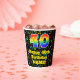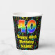 This colourful and fun music-themed birthday paper cup design features a large number “40” with a rainbow spectrum gradient inspired pattern, along with the message “Happy 40th Birthday,”, and a personalised name. The background features an exciting and colourful pattern having music notes and symbols of various sizes and colours. Vibrant, colourful paper cups like this might be fun to use at a birthday celebration/party being held in celebration of somebody’s fortieth birthday. [~Z0000541]
