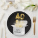 Gold balloons with sparkles and ribbons in a white box on black background for 40th birthday party.