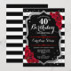 40th birthday party invitation for women. Elegant black white red design with faux glitter silver. Invite card featuring black and white stripes, script font and red roses. Perfect for a stylish milestone bday celebration. Can be personalized to any age.