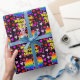 This colourful and cheerful birthday themed wrapping paper design features a large number “40” with a rainbow spectrum gradient inspired pattern, along with the message “Happy 40th Birthday,”, and a personalised name. The background features a pattern of heart shapes with colours like red, pink, and purple. Birthday themed wrapping paper like this might be a fun way to wrap a gift or present being given to celebrate somebody’s fortieth birthday. [~Z0000549]