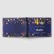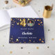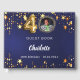 Atrendy navy blue, uneven coloured background with faux gold stars. Add your photo, name, and text. Age number is written with a balloon style font.