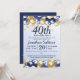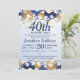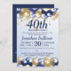 A stylish40th birthday Party Invitation . Design features navy blue and gold balloons, Gold glittery starts and navy blue text all on a pale blue gradient background. A lovely design inviting your guests to join you for a 40th birthday party celebration. Easy to customize with your own party details.