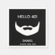 A modern napkin for a 40th birthday party for guys in black and white. With the text: Hello 40! With an image of a beard. Templates for a name and date.