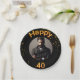 A paper plate for a 40th birthday party for guys. Template for your photo. Black background and the text: Happy 40. The text is written with a trendy faux gold balloon script. Golden confetti as decoration.