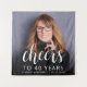This custom 40th birthday tapestry features the guest of honour's personalised photo, name, and birthday, along with the word "Cheers" in elegant white calligraphy script. A dark screen helps make the text pop. A great way to celebrate someone who's turning forty!