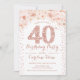 40th birthday party invitation for women. Elegant floral invite card in white, blush pink and faux glitter rose gold. Features typography script font and diamond letters. Perfect for an adult bday celebration.