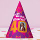 Bright star pattern add your own photo and name party hat. Ideal for a special ladies 40th birthday party celebration. Colourful pink, orange and yellow fortieth birthday design. Background colour can also be changed for your own choice currently yellow. Original art and design by Sarah Trett. www.sarahtrett.com for www.mylittleeden.com