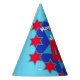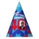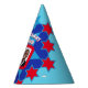 Bright star patterned Personalised custom photo and name birthday party hat. Ideal for a special boys 40th birthday party celebration. Colourful red and blue star design. Background colour can also be changed for your own choice currently light blue. Original art and design by Sarah Trett. www.sarahtrett.com for www.mylittleeden.com