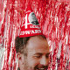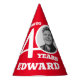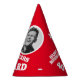 Bright add your own photo and name party hat. Ideal for a special boys 40th birthday party celebration. Colourful red white design. Background colour can also be changed for your own choice currently red. Original graphic art and design by Sarah Trett for www.mylittleeden.com