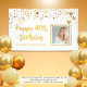 Celebrate a 40th or any age birthday with this custom colour banner sign featuring one photo of him or her, gold stars and your custom text in your choice of font styles and colours. The sample suggests HAPPY 40TH BIRTHDAY NAME shown in a gold brush script typography on a white background. Make changes in EDIT. BANNER OPTIONS: The sample is shown in the 3x5' size; other sizes are available on the ordering page as well as the option of transferring the design to a foam board, poster, tapestry or other product or have the designer convert it to a DIGITAL DOWNLOAD file BEFORE ordering to print locally. ASSISTANCE: For help with design modification or personalisation, colour change, resizing, transferring the design to another product or if you would like coordinating items, contact the designer BEFORE ordering via Zazzle Chat or email makeitaboutyoustore@gmail.com.