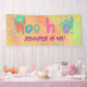 Have fun for a birthday with this WooHoo Birthday Banner. Customise for a year and name (as well as a different event). The text "WooHoo" is on a multicolor orange, coral and yellow background with magenta and teal green flowers. The topography is hand drawn and is multicolors of orange, magenta, blue green and yellow.