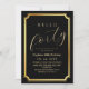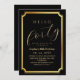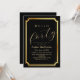 Modern stylish birthday party invitation black with gold dust on with a gold ink pour effect (the gold is a digital effect, not real foil) and modern calligraphy. Classy and elegant, simple and modern invitation.