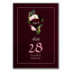 40th wedding anniversary table number card featuring a monogrammed ruby gemstone decorated with blush pink and deep burgundy plum florals and geometric gems.