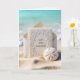A beautifully embossed wedding invitation card rests inside an envelope on the sand near the ocean's edge, accompanied by a sand dollar for a 40th wedding anniversary.