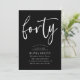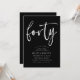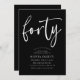 This modern, white on black design features the word "forty" in a script style calligraphy and an elegantly spaced, modern typography comprising classical serif fonts. The invitations reverse to a delicate repeating triangle pattern in black and chromatic grey. Suitable for men or women. Choose from printed Zazzle invitations with different corner styles and gorgeous paper stock, or instant download if you need it now, or both so you can send paper and digital invites as required.