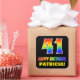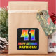 This colourful, cheerful, and fun birthday themed sticker design features a large number "41" and the message "HAPPY BIRTHDAY,", both coloured with a rainbow spectrum gradient inspired pattern, along with a bold yellow custom name. The background is coloured black. Fun birthday themed stickers like this might be used when wrapping a gift or present being given to somebody who is celebrating their forty first birthday, or perhaps might be handed out to the guests at a birthday party. [~Z0000480]