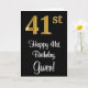This sophisticated, elegant, and luxurious birthday-themed greeting card design features a large ordinal number “41st” having a faux/imitation gold-inspired look, in addition to the birthday greeting message “Happy 41st Birthday,” and a customizable name in a script-style font on the front. The background of the front is colored black. The inside has a personalized birthday greeting message, or could perhaps be cleared and left blank if a message is to be written by hand instead. A sophisticated customizable birthday greeting card like this might be a fun way to deliver birthday greetings to somebody who is celebrating their forty-first birthday. [~Z0000518]