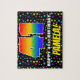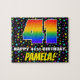 This bold and joyful birthday-themed jigsaw puzzle design features a large number “41” with a multicolored rainbow spectrum inspired gradient pattern, along with the message “HAPPY 41st BIRTHDAY,”, and a custom recipient name. The background has a fun, multicolored star field pattern. An eye-catching, personalised birthday puzzle like this might be a fun way to deliver birthday wishes to somebody who is celebrating their forty-first birthday. [~Z0000607]
