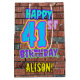 The front of this fun birthday themed gift bag design features the message “HAPPY 41ST BIRTHDAY,” having a vibrant, colourful, graffiti-inspired appearance, plus a personalised recipient name. The background features a brick wall inspired pattern. A giftbag like this might be used when wrapping gifts being given to somebody in celebration of their forty first birthday. [~Z0000536]