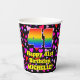 This happy and fun birthday-themed paper cup design features a large number “41” having a rainbow spectrum gradient inspired pattern. It also features the message “Happy 41st Birthday,”, and a customisable name. The background features a pattern of heart shapes with colours like red, pink, and purple. Happy, cheerful paper cups like this might be fun to use at a birthday party/celebration being held to celebrate somebody’s forty first birthday. [~Z0000548]