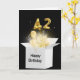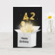 Gold balloons and sparkling light beams glow in a white box on black background for 42nd birthday