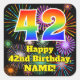 This fun and exciting birthday square sticker design features a large number “42” with a colourful rainbow spectrum gradient inspired pattern, along with the message “Happy 42nd Birthday,”, and a custom name. The background features a colourful pattern inspired by the appearance of bursting celebratory fireworks. Vibrant, fun, personalised stickers like this might be given as a birthday gift, or used while wrapping presents/gifts, or perhaps used as birthday party decorations when celebrating somebody’s 42nd birthday. [~Z0000579]