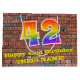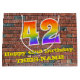 This vibrant and colourful birthday themed gift bag design, inspired by street art, features a large number "42" having a rainbow spectrum gradient inspired pattern. It also features the message "Happy 42nd Birthday,", and a personalised name. It also has a brick wall inspired pattern background. A fun gift-bag like this might be a fun way of wrapping a birthday present or gift being given to somebody who is celebrating their forty second birthday. [~Z0000522]