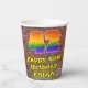 This vibrant and exciting urban graffiti and street art themed birthday paper cup design features a large number “42” with a colourful rainbow spectrum gradient inspired pattern, along with the message “Happy 42nd Birthday,”, and a personalised name. The background features a brick wall pattern. Colourful, vibrant paper cups like this might be fun to have at a birthday celebration/party being held in celebration of somebody’s 42nd birthday. [~Z0000543]