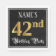 This fancy and luxurious birthday-themed paper napkin design features a personalised name and the message “42nd Birthday Party”. The large number “42nd” has an imitation/faux gold-inspired colouring pattern, and the words “Birthday Party” are in elegant script-style text. The background is coloured black by default (although it can be customised). Elegant, opulent paper napkins like this might be useful at a birthday party being held to honour somebody’s 42nd birthday. [~Z0000565]