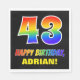 This cheerful, colourful, and fun birthday paper napkin design features a large number "43" and the message "HAPPY BIRTHDAY,", both coloured with a rainbow spectrum gradient inspired pattern, along with a bold yellow customisable recipient name. The background is coloured black. Fun, customised paper napkins like this might be used at a party being held to celebrate somebody’s forty third birthday. [~Z0000476]