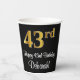 This elegant, stylish, and luxurious birthday paper cup design features a large ordinal number “43rd” having a faux/imitation gold-inspired appearance, along with the birthday greeting message “Happy 43rd Birthday,” and a custom name in a script-style font. It also has a black-coloured background. Stylish birthday themed paper cups like this might be used at a party for somebody who is celebrating their 43rd birthday. [~Z0000538]