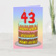 This colourful and fun birthday-themed greeting card design features a cartoon-style depiction of a three-tier birthday cake having numeral-shaped candles on top showing the number “43“, along with the message “HAPPY 43RD BIRTHDAY,”, and a customisable recipient name. The background of the front features a multicolored pastel rainbow spectrum inspired gradient pattern. The inside has a personalised birthday greeting message, or could perhaps be cleared and left blank if a message is to be written by hand instead. An upbeat, customisable birthday greeting card like this might be used to acknowledge somebody’s forty-third birthday. [~Z0000625]