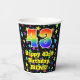 This joyful and fun birthday-themed paper cup design features a large number “43” having a rainbow spectrum gradient inspired pattern. It also features the message “Happy 43rd Birthday,”, and a customisable name. The background features a multicolored pattern inspired by a field of stars. Colourful, vibrant paper cups like this might be fun to use at a birthday party being held to honour somebody’s forty third birthday. [~Z0000540]