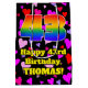 This fun and happy birthday-themed giftbag design features a large number “43” having a rainbow spectrum gradient inspired pattern. It also features the message “Happy 43rd Birthday,”, and a personalised name. The background features a pattern of purple, pink, and red heart shapes. A birthday themed gift bag like this might be a fun way to wrap a gift or present being given to celebrate somebody’s forty third birthday. [~Z0000551]