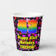 This cheerful and colourful birthday themed paper cup design features a large number “43” having a rainbow spectrum gradient inspired pattern. It also features the message “Happy 43rd Birthday,”, and a custom name. The background features a pattern of purple, red, and pink heart shapes. Loving, upbeat paper cups like this might be fun to have at a birthday celebration being held in celebration of somebody’s forty third birthday. [~Z0000548]