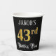 This luxurious and opulent birthday paper cup design features a customisable name and the message “43rd Birthday Party”. The large number “43rd” has an imitation/faux gold-inspired colouring pattern, the words “Birthday Party” are in fancy script-style text, and the background is coloured black by default (although it can be customised). Fancy, elegant paper cups like this might be useful at a birthday party/celebration being held to celebrate somebody’s 43rd birthday. [~Z0000567]