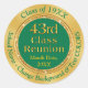 43rd Class Reunion Party Stickers for Favours. Choose the Size and Glossy or Matt Finish or TRANSFER this Green and Gold, 43rd class reunion, design to over 1000 other products, party supplies and gifts. You can CHANGE the GREEN Background and Text and the Green and Gold Text to ANY COLORS. Only Designer Linda: 239-949-9090 EST, 10am to 6pm EST, Monday to Friday or Weekends as available, can CHANGE the GOLD Borders and 43rd class reunion design.