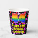 This happy and joyful birthday themed paper cup design features a large number “44” having a rainbow spectrum gradient inspired pattern. It also features the message “Happy 44th Birthday,”, and an editable name. The background features a pattern of red, purple, and pink heart shapes of various sizes. Loving, fun paper cups like this might be fun to use at a birthday party being held in celebration of somebody’s 44th birthday. [~Z0000548]