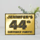 The front of this bold forty-fourth birthday party foil invitation card features a custom name, a large number “44th”, the message “BIRTHDAY PARTY!”, and a border, all featuring a rustic, yet sophisticated, faux wood grain look inspired pattern. The back features personalised details about the event, such as the date, time, venue/location, and any other useful information. Editable invitations like these might be used to invite attendees/guests to a birthday party being held to honour somebody’s 44th birthday. [~Z0000595]