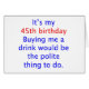 "It's my 45th birthday, buying me a drink would be the polite thing to do." Humourous design for that 45 year old who loves to make people laugh and if a free drink comes out of the deal so be it.