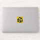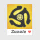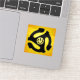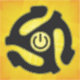 45 RPM Audiophile power record adapter sticker. A silhouette of a 45 rpm adapter with a power on off symbol in the centre (IEC 5009 symbol). Black with yellow outline over a yellow and orange background. Power up with some classic vintage vinyl records!