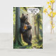 A bear stands leisurely against a tree holding a mug of beer with one paw in a sunlit summer forest with a humourous speech bubble for a 45th birthday.