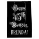 This elegant and fancy birthday-themed giftbag design features the message “Happy 45th Birthday,” in ornate script style text, on a black coloured background. It also features a custom recipient name. A formal gift bag like this might be a respectable way of wrapping a birthday present or gift being given to somebody who is celebrating their 45th birthday. [~Z0000557]