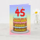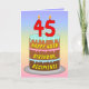 This colourful and joyful birthday-themed greeting card design features a cartoon-style depiction of a three-tier birthday cake having numeral-shaped candles on top showing the number “45“, along with the message “HAPPY 45TH BIRTHDAY,”, and a personalised recipient name. The background of the front has a multi-colour pastel rainbow spectrum inspired gradient pattern. The inside has a customised birthday greeting message, or could perhaps be cleared and left blank if a message is to be written by hand instead. A cheerful, customisable birthday greeting card like this might be used to celebrate somebody’s forty-fifth birthday. [~Z0000625]