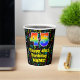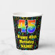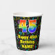 This exciting and fun music-themed birthday paper cup design features a large number “45” having a rainbow spectrum gradient inspired pattern. It also features the message “Happy 45th Birthday,”, and an editable name. The background features a multicolored pattern having music notes and symbols of various colours and sizes. Vibrant, colourful paper cups like this might be fun to use at a birthday party being held to celebrate somebody’s forty fifth birthday. [~Z0000541]